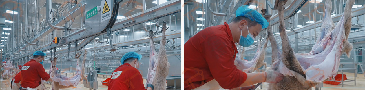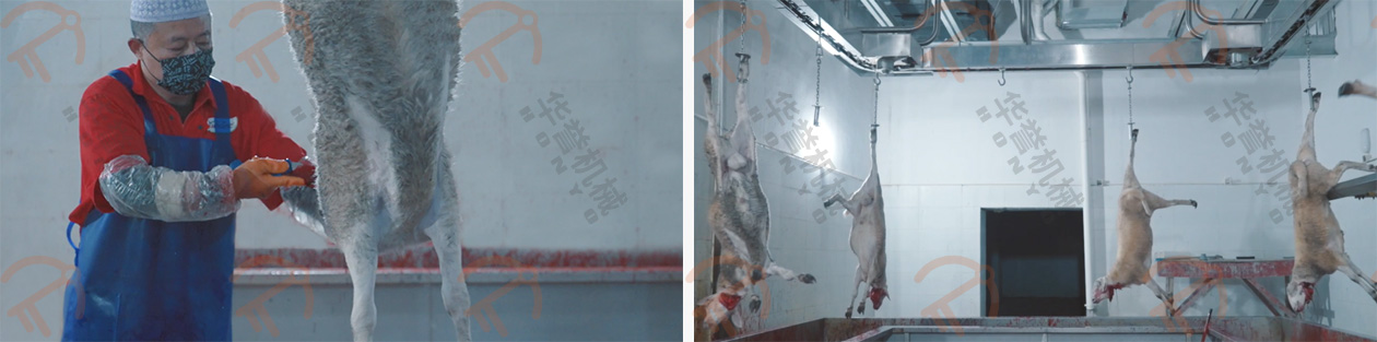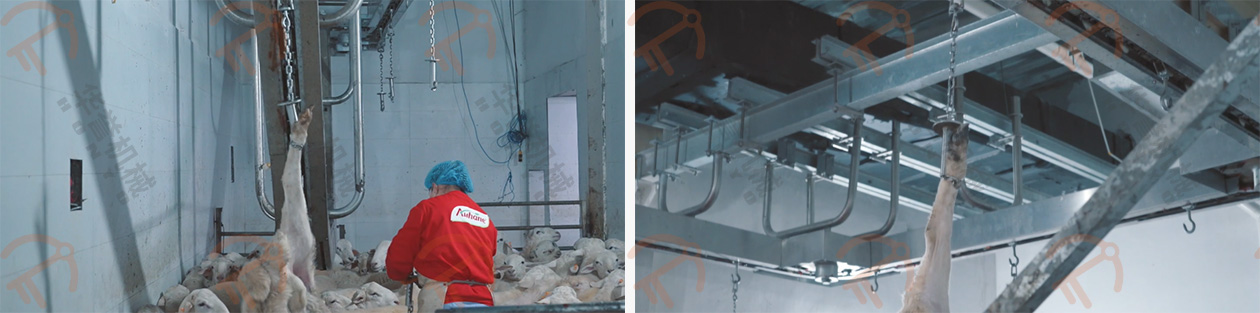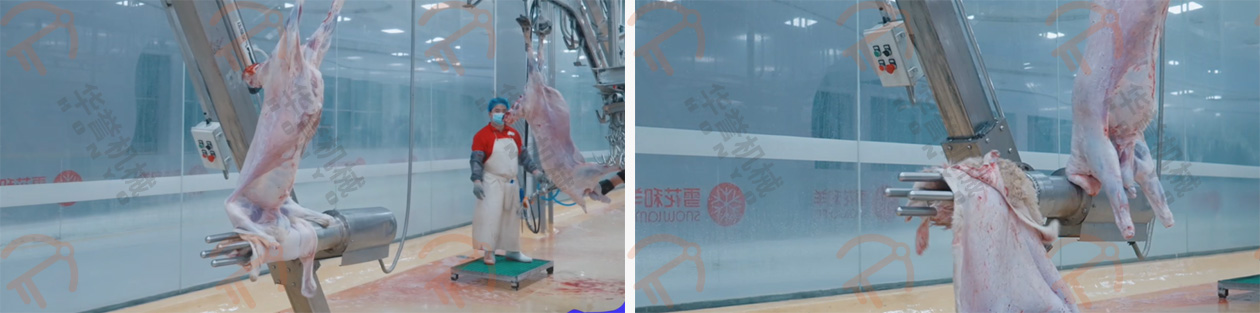 放血/預剝自動輸送線的掛鉤鉤住羊的后腿,扯皮自動輸送線的掛鉤鉤住羊的兩前腿,這兩條自動線的速度是同步前進的,羊的腹部朝上、背部朝下,平衡前進,在輸送的過程中進行預剝皮,這種預剝的方式可有效的控制在預剝過程中羊毛粘在胴體上。